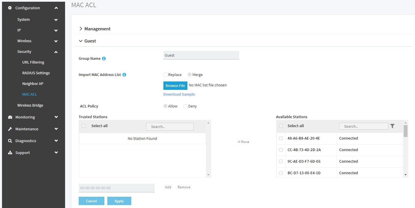 若 ACL Policy選擇Allow,命名為Trusted Stations。列表中的MAC位置將是白名單,才能連接成功。